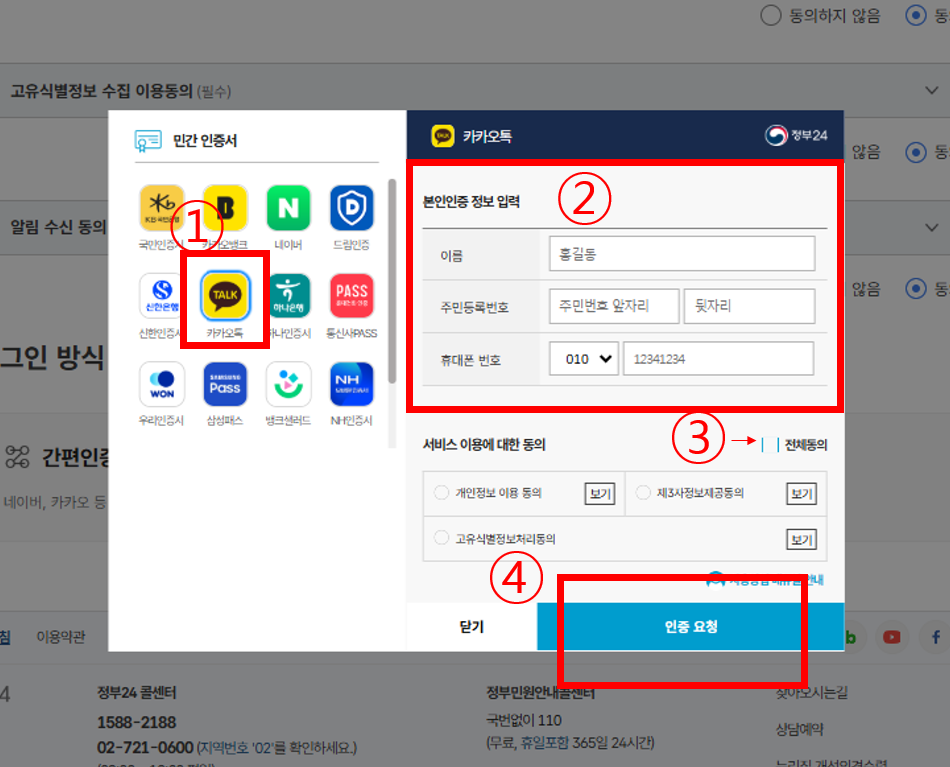 정보 입력 칸에 알맞은 정보 입력후 오른쪽 하단에 인증요청 선택